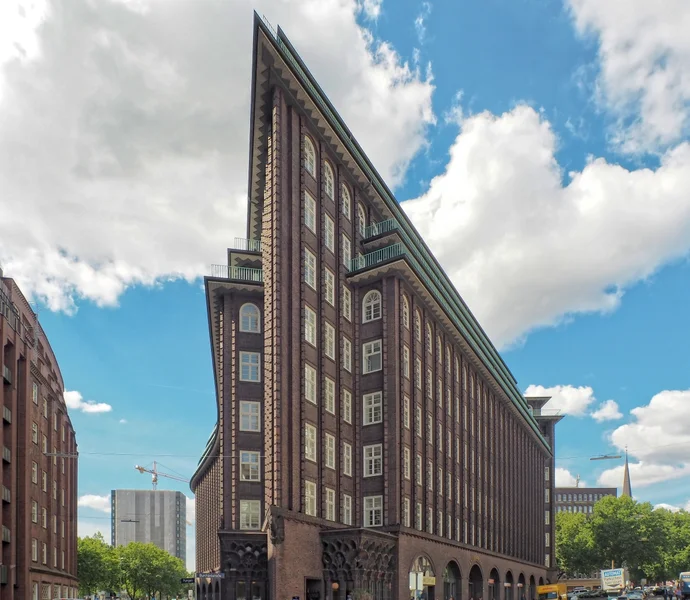 Das Chilehaus ist wohl eines der bekanntesten Gebäude in Hamburg - vielleicht sogar in ganz Deutschland. Als UNESCO Weltkulturerbe reiht sich dieses Haus nahtlos in seine Umgebung ein - nämlich dem geschichtsträchtigen Kontorhausviertel zwischen Speicherstadt und City. Es verbindet unterschiedliche Nutzungsmöglichkeiten - insbesondere aber Einzelhandel und Büro. Über knapp 25.000 m² verfügt dieses Gebäude, erbaut wurde es 1924. Bleiben wir erst einmal bei der Lage im Kontorhausviertel. Neben zahlreichen gastronomischen Einrichtungen, die unterschiedlichste Küchen vereinen, gibt es ebenfalls Einkaufsmöglichkeiten für den täglichen Bedarf, Banken und vieles mehr. Darüber hinaus ist eine hervorragende Anbindung an den ÖPNV gewährleistet - also die Anfahrt in Euer zukünftiges Büro gestaltet sich definitiv unkompliziert.
