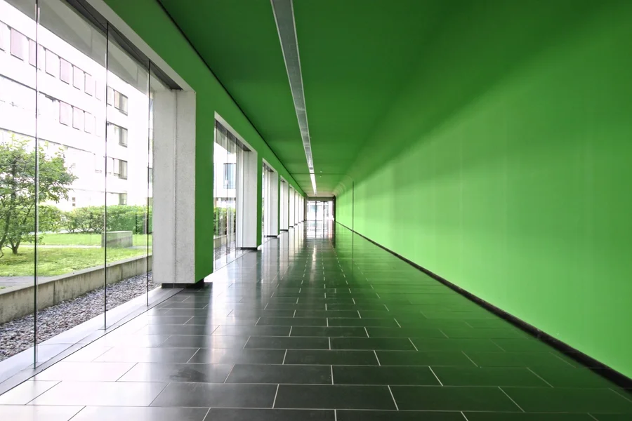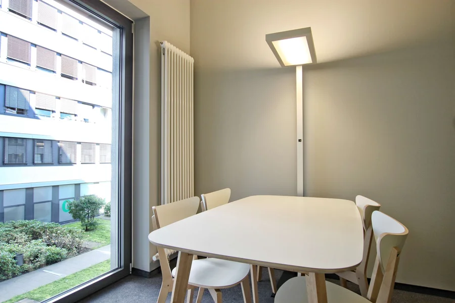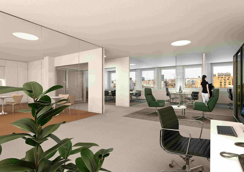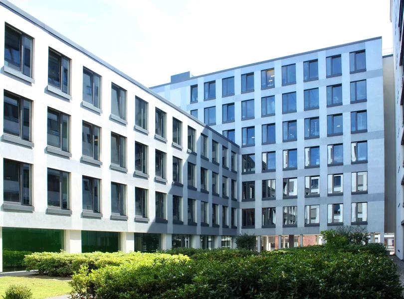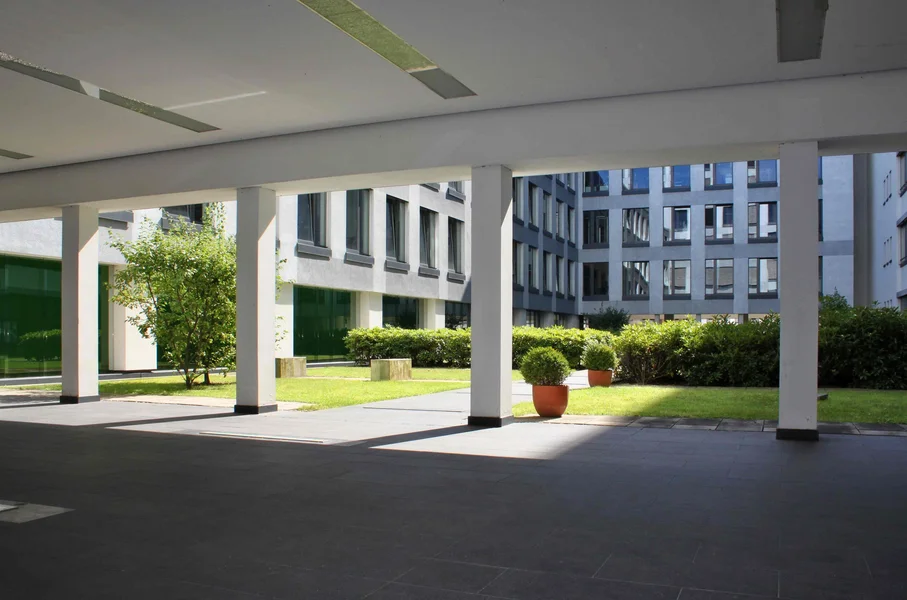 Ein besonderes Highlight sind die zwei begrünten Innenhöfe – einer davon begehbar bis zum Mittelkanal. Diese grünen Oasen stehen euch und eurem Team als Erholungszonen mitten in der Stadt zur Verfügung.