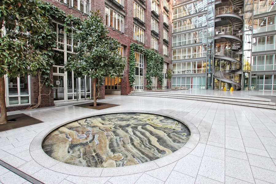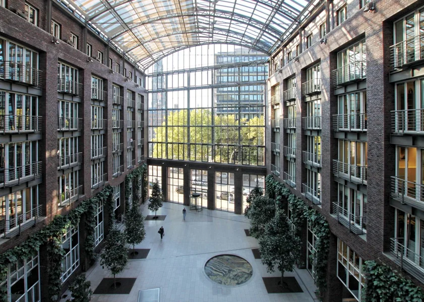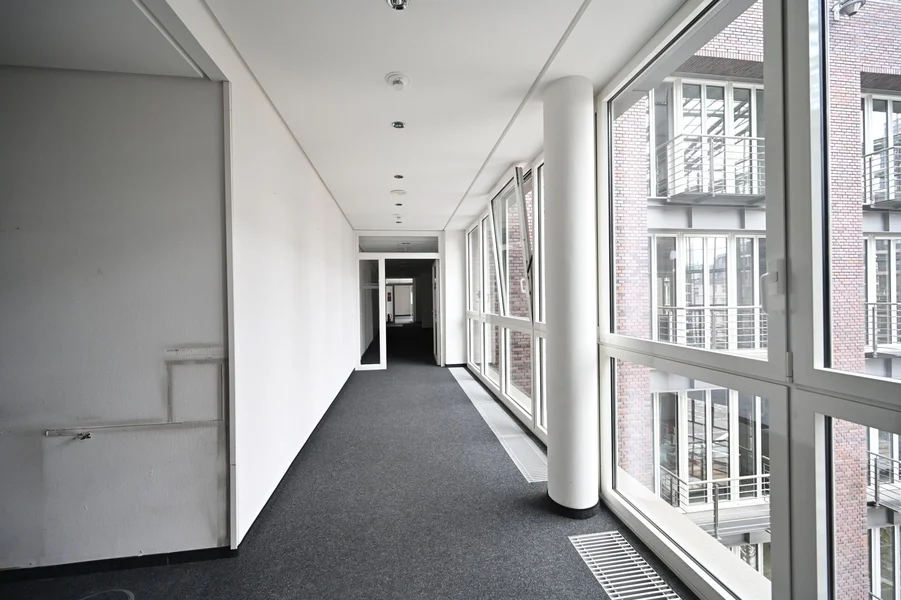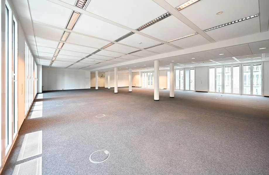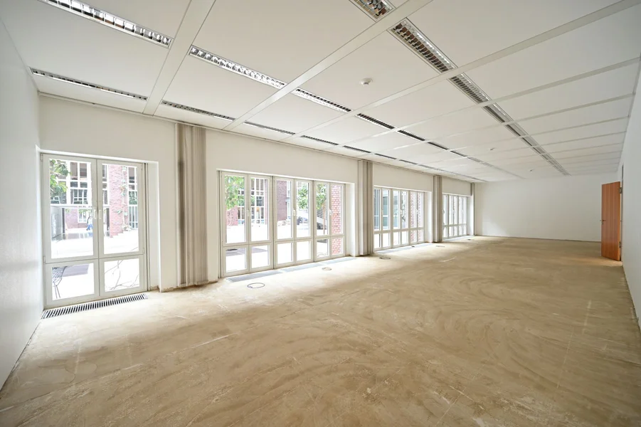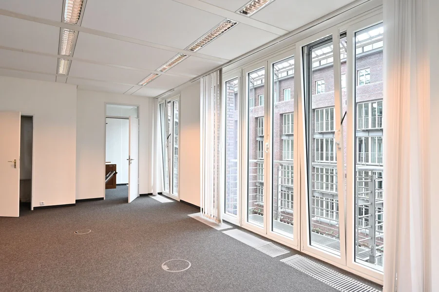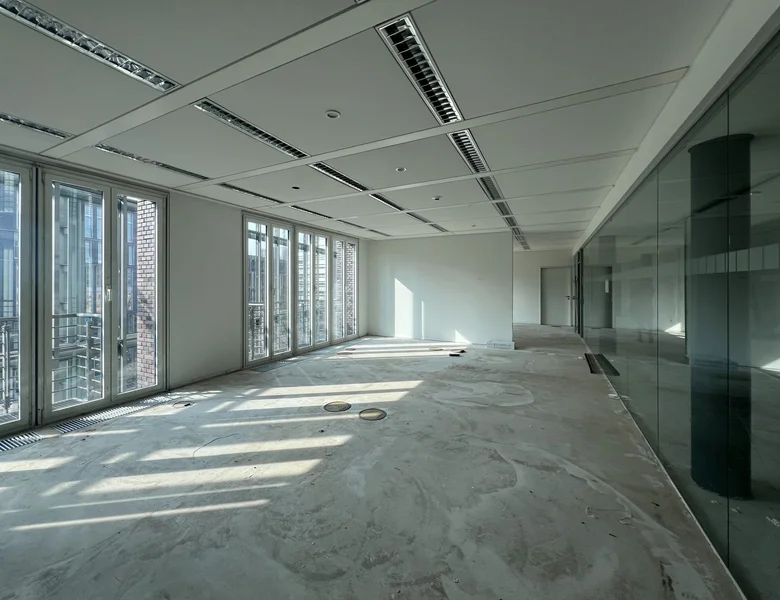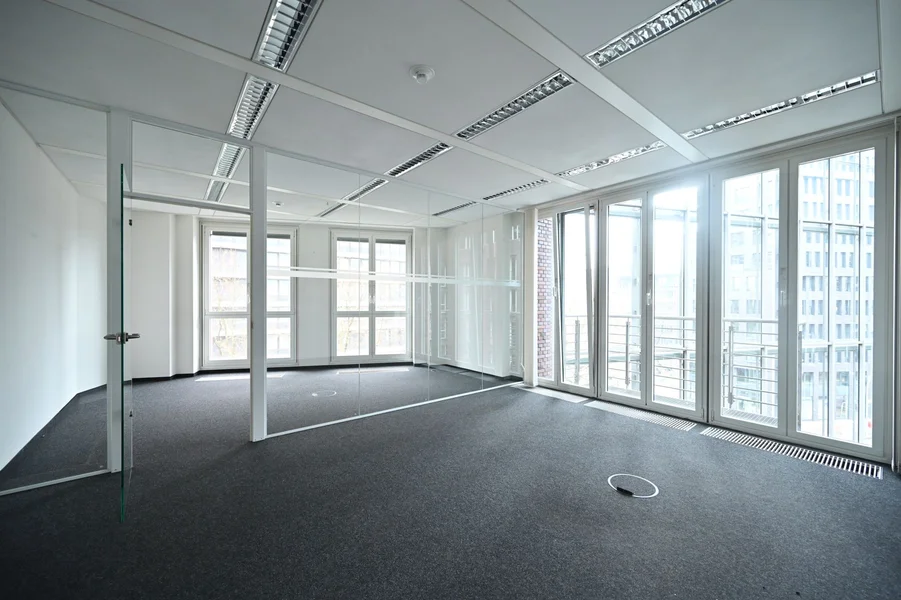 Die geschwungene Glasfront zur Willy-Brandt-Straße beeindruckt architektonisch und hält gleichzeitig den Straßenlärm ab. Im ersten Obergeschoss steht eine vielseitig nutzbare Bürofläche bereit – ideal für Agenturen, Showrooms oder klassische Büros.