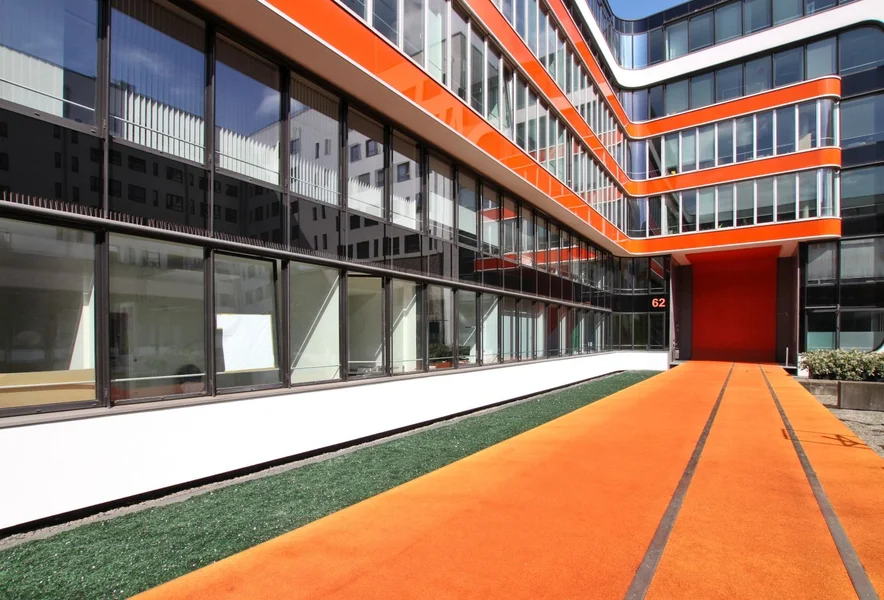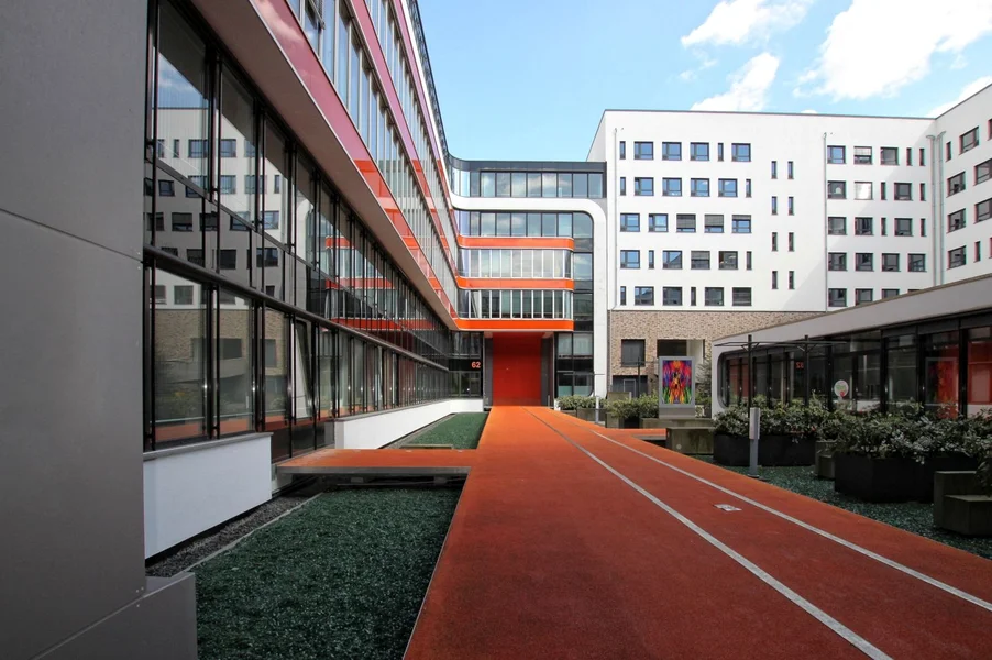 Im rückwärtig gelegenen Innenhof – dem campusartigen Herzstück des Ensembles mit Tartanboden – befinden sich die Zugänge zu den einzelnen Gebäudeteilen, in denen Eure neuen Büroflächen auf Euch warten.