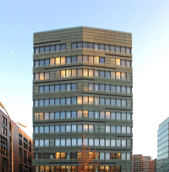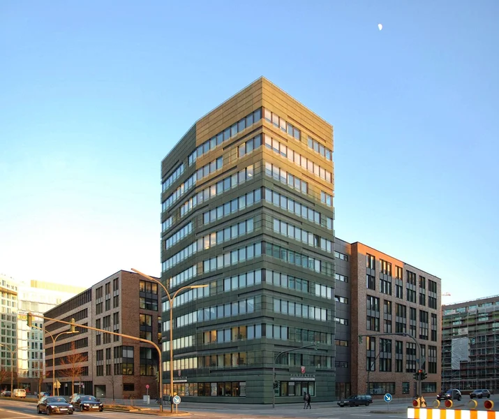 Genau zwischen Überseequartier und Hauptbahnhof befindet sich dieses Haus, eindrucksvoll ragt der Turm in die Höhe und wirkt markant durch seine grün schimmernde Fassade und die 10 Obergeschosse.
