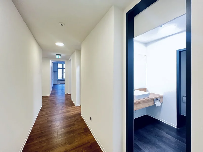 Unter Berücksichtigung des Denkmalschutzes wurde dieses repräsentative Haus 2003 vollumfänglich saniert. Dabei wurde die Fassade komplett erhalten und aufgewertet, im Inneren jedoch wert darauf gelegt, zeitgemäße und modern ausgestattete Büroflächen zu schaffen. Diese erschließt Ihr über den ebenfalls modernisierten und hochwertig gestalteten Eingangsbereich. Personenaufzüge bringen Euch bequem in Eure neuen - dank der großen Fenster - gut belichteten Mietetagen. Die Freifläche im Hochparterre besticht durch den offenen modernen Bürobereich, zudem stehen Euch ebenfalls noch abgetrennte Büros zur Verfügung. Die Aufteilung ist daher sehr effizient.