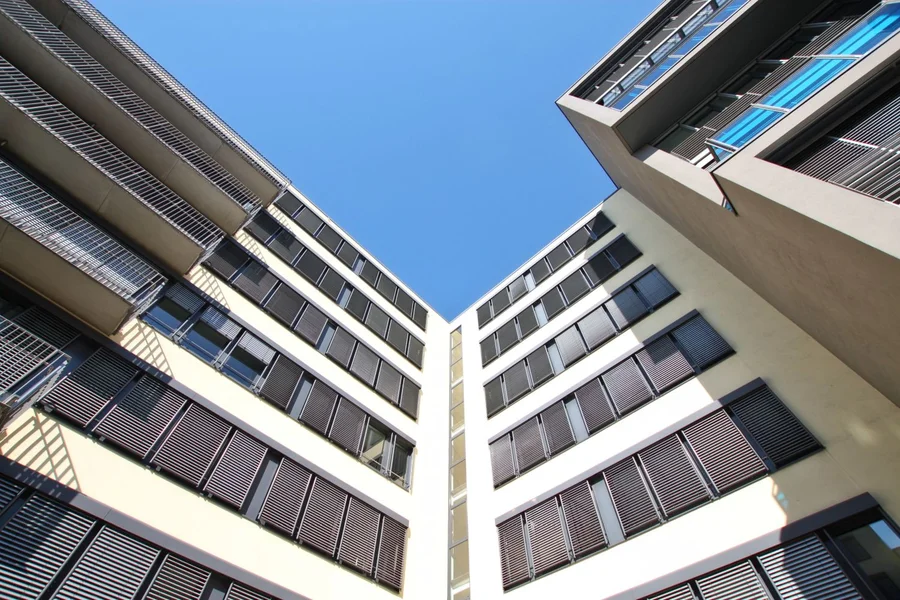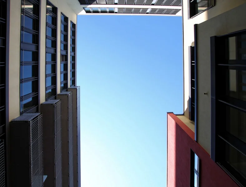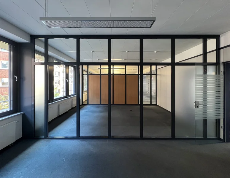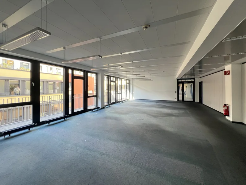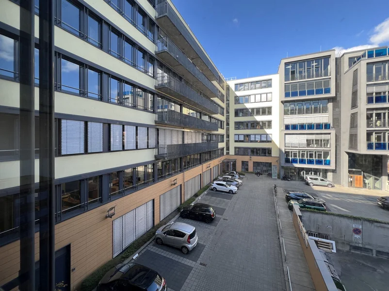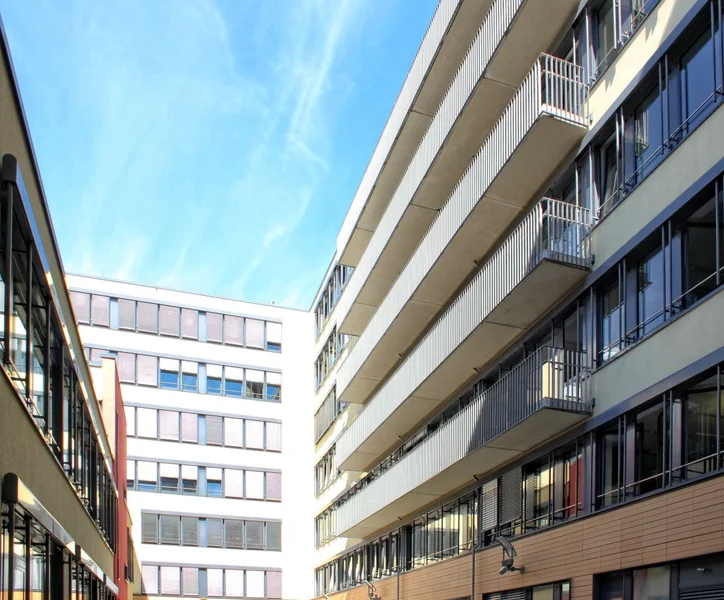 Große, bodentiefe Fensterfronten schaffen in vielen Bereichen einen hohen Tageslichtanteil in den Büroräumen. Außerdem können die Mieter die attraktive Wasserlage oder die Ruhe des Innenhofes auf eigenen Balkonen genießen.