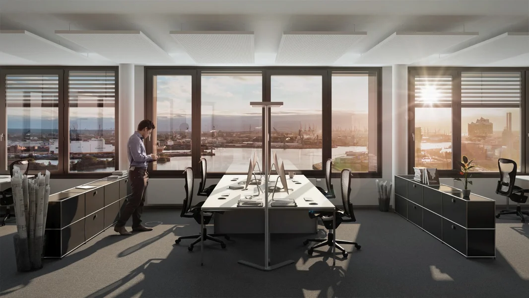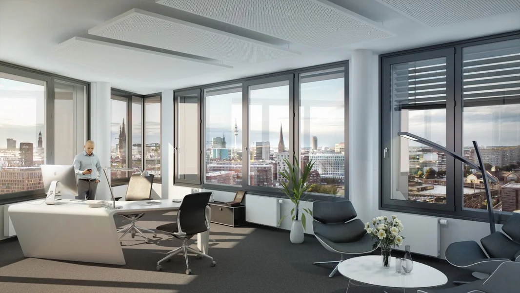Hier arbeitest du auf Top-Niveau – in lichtdurchfluteten Büros mit großen Fensterfronten, wirtschaftlichen Grundrissen und einem Rundumblick über Hamburg, den man nicht so schnell vergisst. Die oberen Etagen bieten dir 360° Panorama pur – perfekt für klare Gedanken und große Ideen.