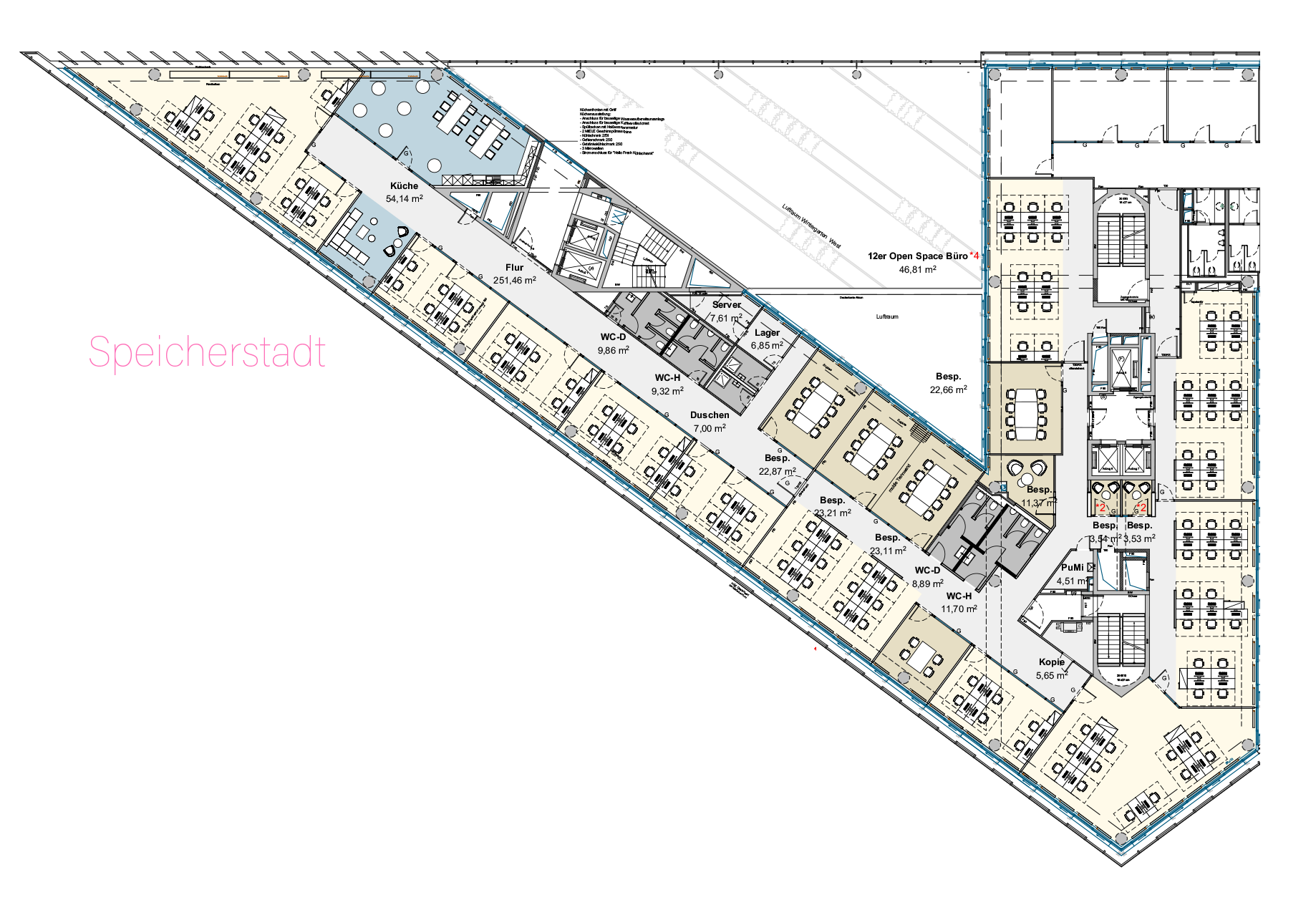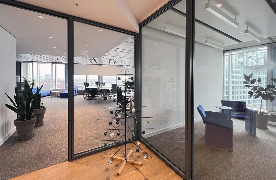 Gut belichtete Büros mit Blick auf die Elbe, die Speicherstadt und die HafenCity erwarten Euch. Eine doppelschalige Glasfassade sorgt für konzentriertes Arbeiten in gekühlten Räumen. Bis zu 1.900 m² fasst das Regelgeschoss, sodass die Unterbringung von bis zu 100 Mitarbeitern auf einer Ebene möglich ist. Zur Ausstattung dieses Teherani-Baus gehört u.a.: Kühlung durch Betonkernaktivierung, Be- und Entlüftung, außenliegender Sonnenschutz, Hohlraumboden, flexible Raumaufteilung und ausreichend Tiefgaragenstellplätze, von denen Ihr direkt in Euer Büro gelangt.