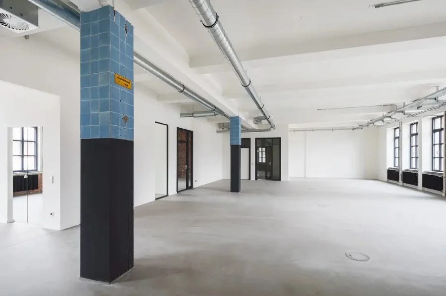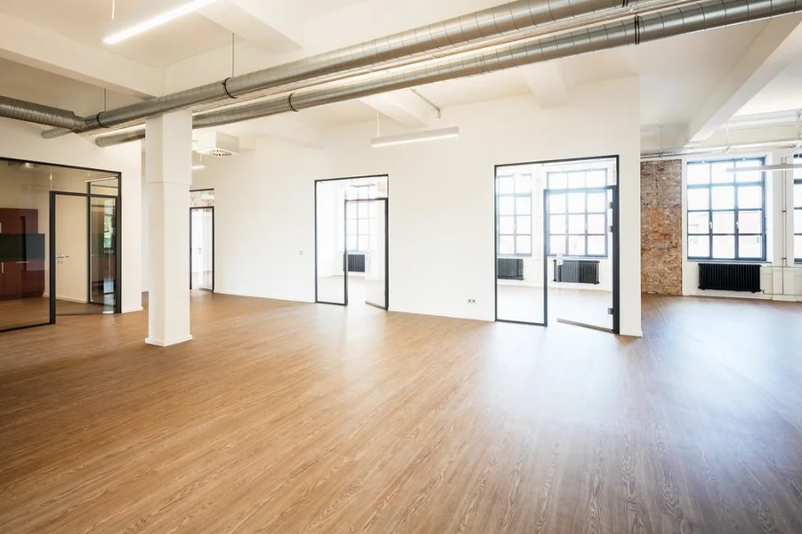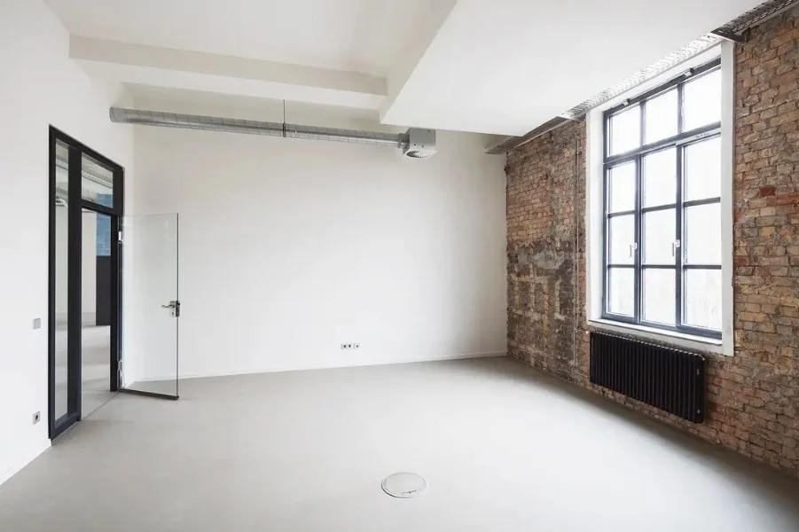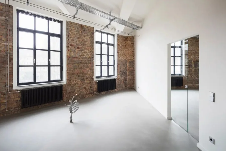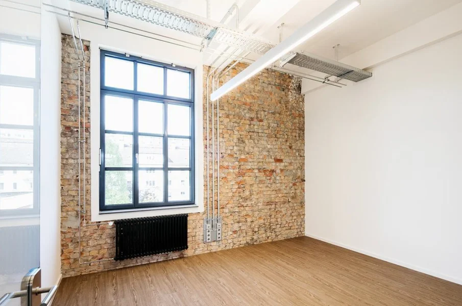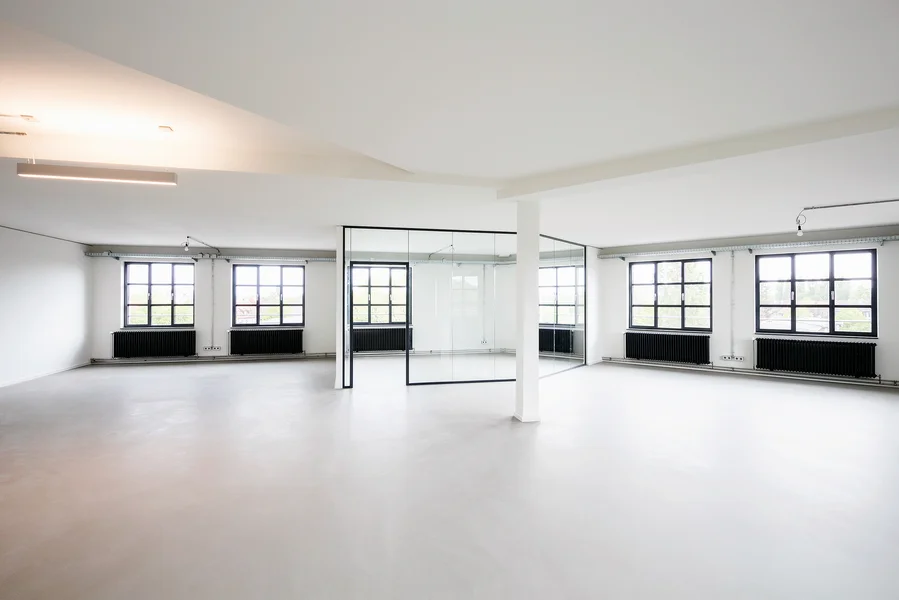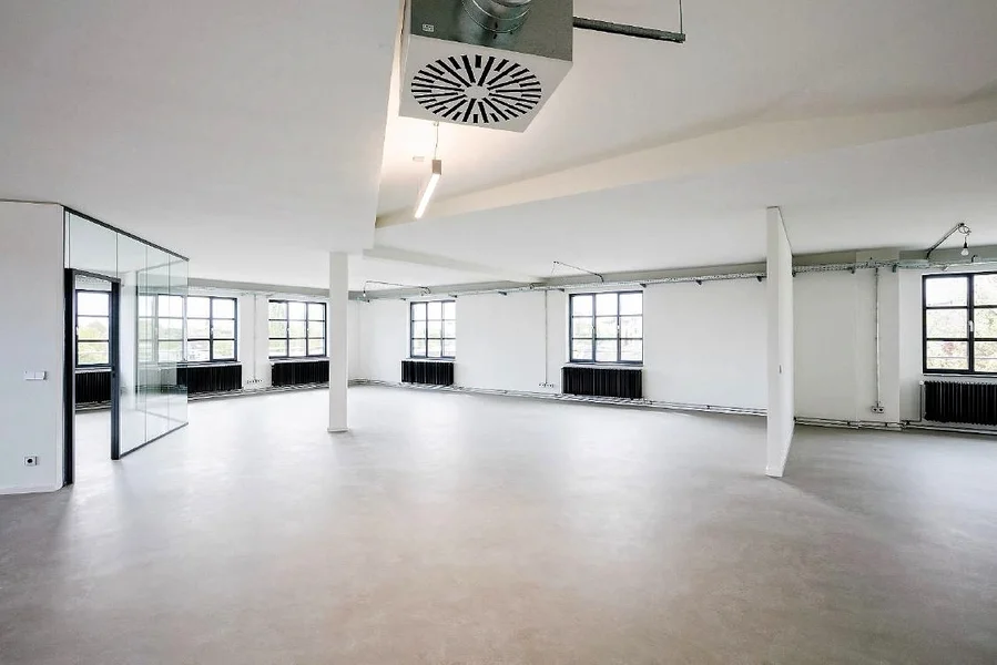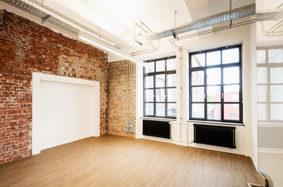 Die ehem. Lagerflächen erhalten neben einer neuen, modernen Fassade auch einen gläsernen Aufzug, der Euch und Eure Kollegen in die Büroetagen befördert. Die vorhandenen Sprossenfenster werden durch neue, moderne Fenster im gleichen (Sprossen-) Stil ausgetauscht und vergrößert - teils sogar bodentief, sodass viel Licht ins Innere des Gebäudes gelangt. Insbesondere die Deckenhöhen von bis zu 3,75 Metern tragen ihren Teil dazu bei. Der Vermieter achtet peinlich genau darauf, dass der industrielle Charme der alten Bäckerei hier nicht verloren geht - Industrie-chic trifft modernes Loft!