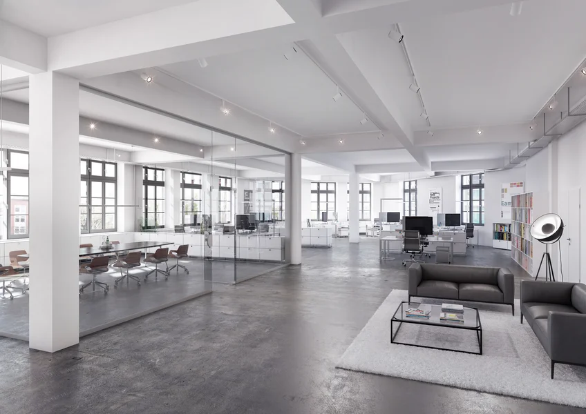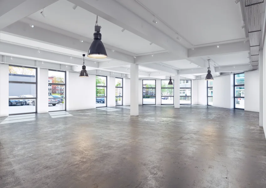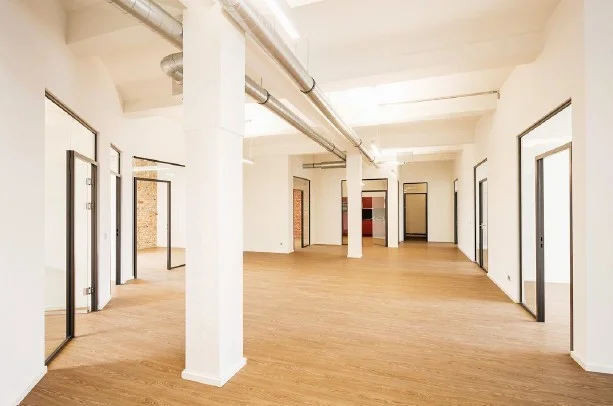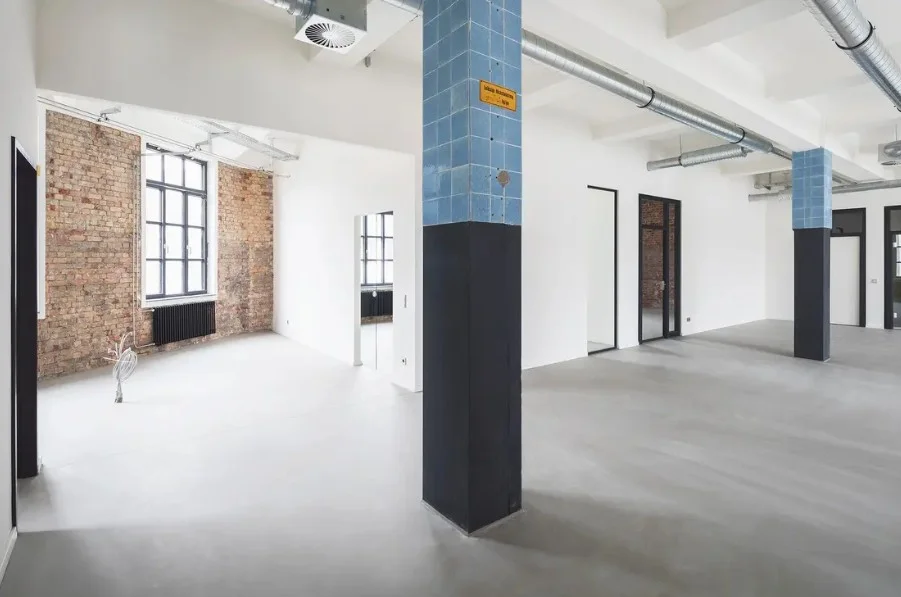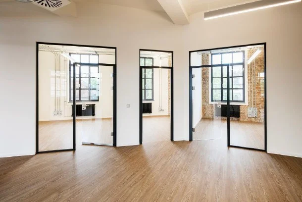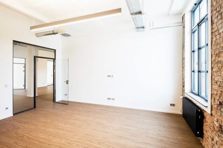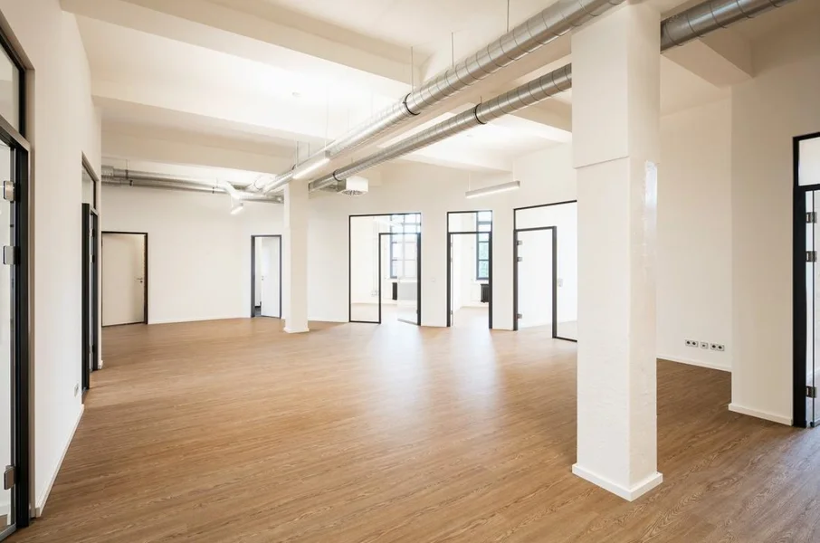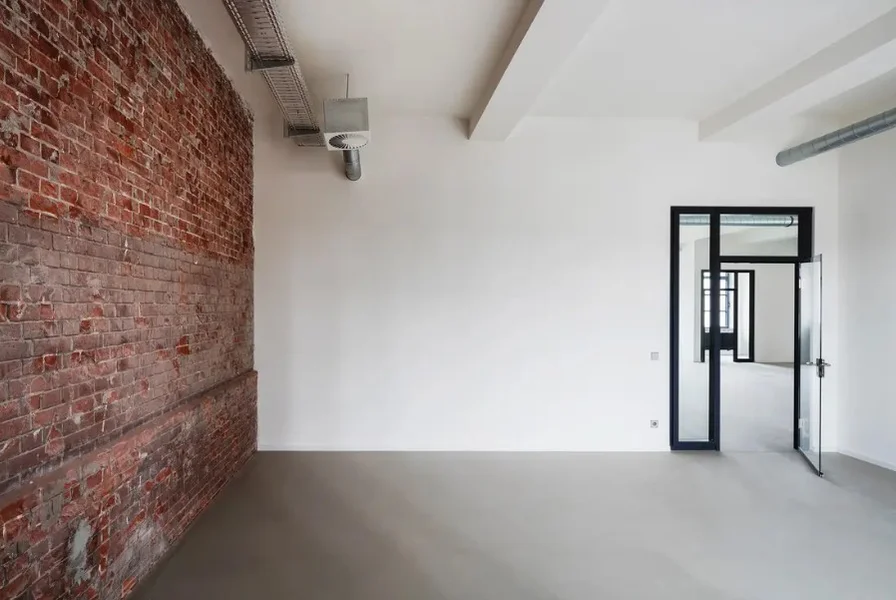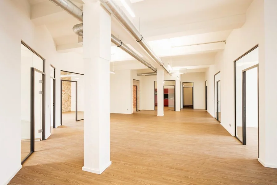 Die ehem. Lagerflächen erhalten neben einer neuen, modernen Fassade auch einen gläsernen Aufzug, der Euch und Eure Kollegen in die Büroetagen befördert. Die vorhandenen Sprossenfenster werden durch neue, moderne Fenster im gleichen (Sprossen-) Stil ausgetauscht und vergrößert - teils sogar bodentief, sodass viel Licht ins Innere des Gebäudes gelangt. Insbesondere die Deckenhöhen von bis zu 3,75 Metern tragen ihren Teil dazu bei. Der Vermieter achtet peinlich genau darauf, dass der industrielle Charme der alten Bäckerei hier nicht verloren geht - Industrie-chic trifft modernes Loft!