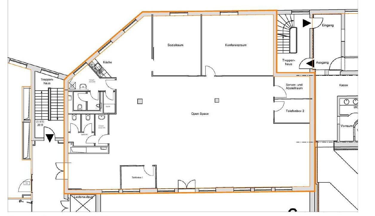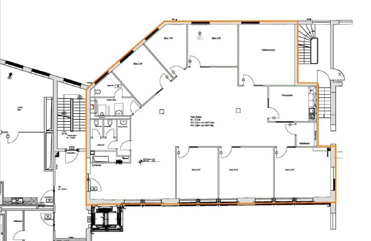 Der vorhandene Lastenaufzug bleibt erhalten, sodass auch schwere Materiallieferungen kein Problem darstellen. Die Räume sind dank weniger Stützen flexibel aufteilbar. Eine OpenSpace-Nutzung ist zu empfehlen, aber kein Muss.