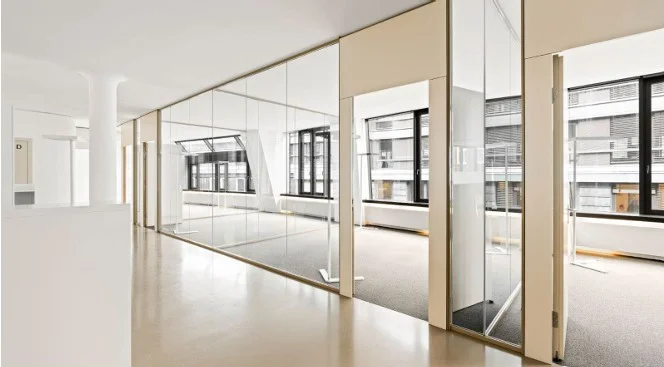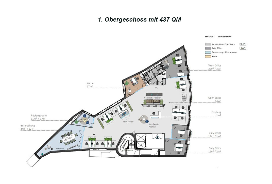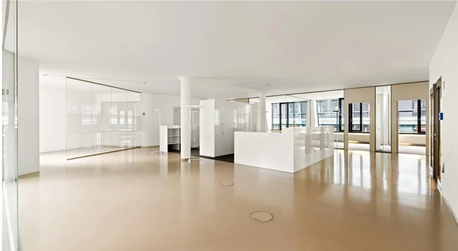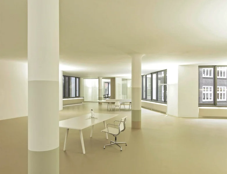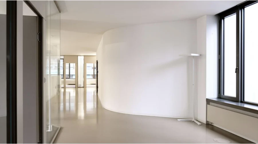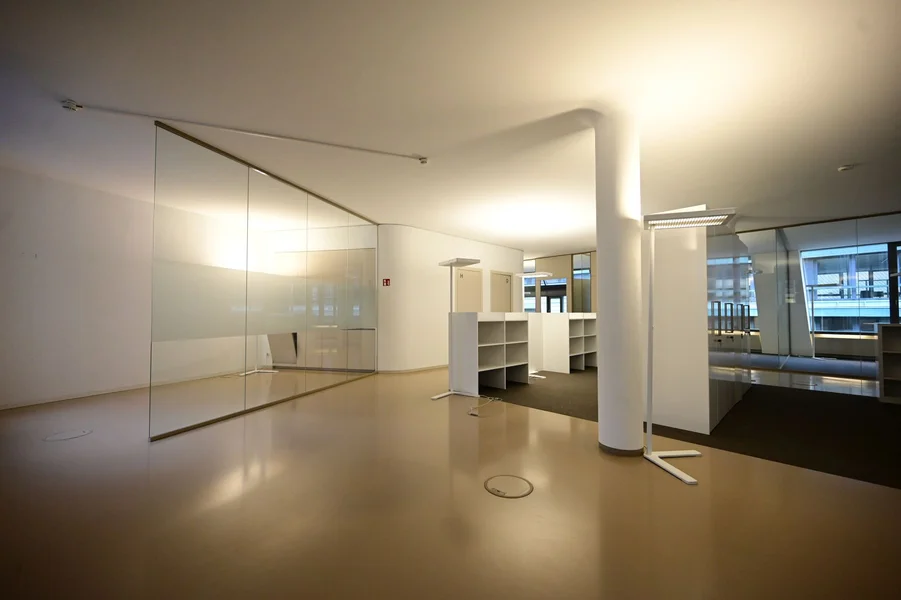 Über den minimalistisch gestalteten Eingangsbereich gelangt Ihr in das Objekt. Von hier aus bringen Euch farbenfrohe (ja, sie sind tatsächlich pink!) Personenaufzüge in Eure neuen Mietetagen die ganz nach Euren Wünschen ausgebaut und aufgeteilt werden. Der Grundriss der Flächen entspricht kurz gesagt dem Äußeren dieser Immobilie und ist alles andere als Standard. Daraus resultiert, dass insbesondere OpenSpace Büros in diesem Objekt sehr gut realisierbar sind. Klassische, abgetrennte Büros sind durchaus umsetzbar, versprechen aber nicht die ideale Nutzung der Flächen.