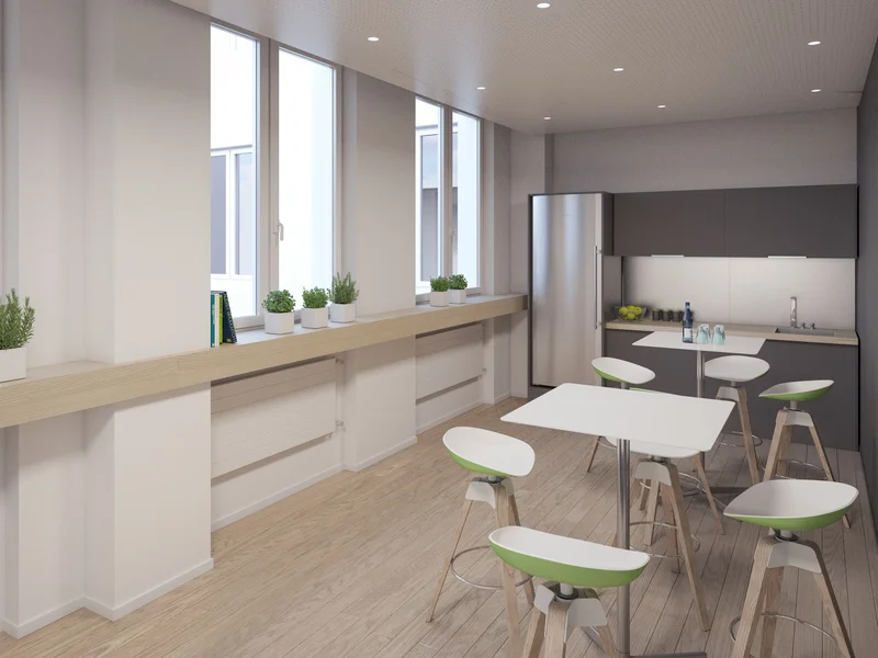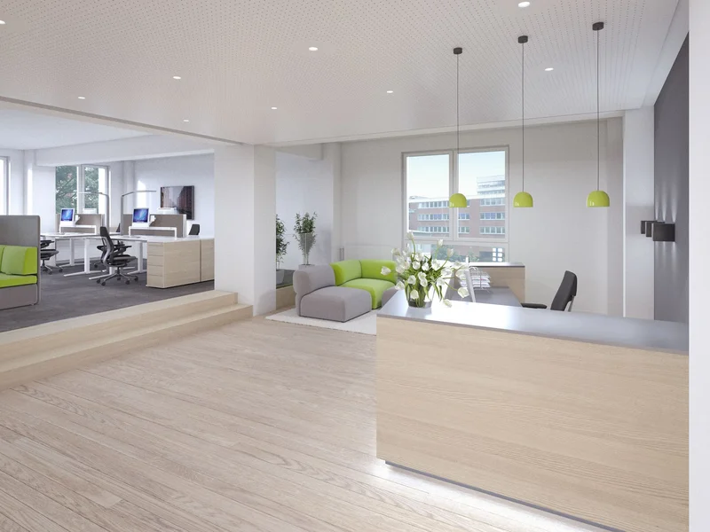 Die lichtdurchfluteten Räume können in enger Abstimmung mit den künftigen Mietern individuell ausgebaut und gestaltet werden. Dabei wird eine maßgeschneiderte Raumaufteilung nach den spezifischen Bedürfnissen des jeweiligen Unternehmens geschaffen. Zur modernen Ausstattung gehören unter anderem Hohlraumböden im Neubau bzw. Kabelkanäle im Altbau, teilweise Balkone, hochwertige Stehleuchten, eine effiziente Be- und Entlüftungsanlage, neue Teeküchen sowie Bodenbeläge nach den Wünschen der Mieter.