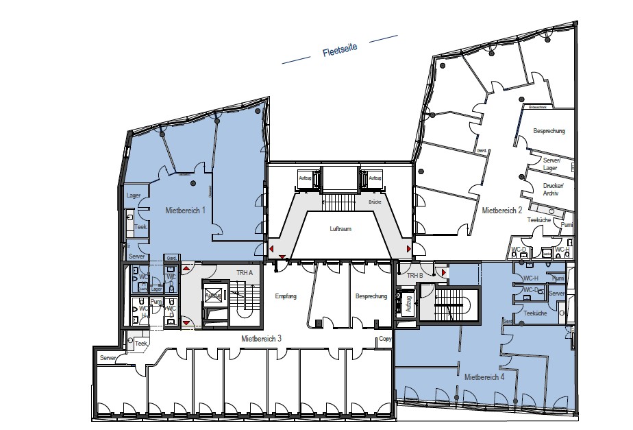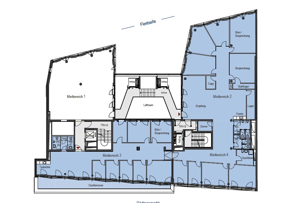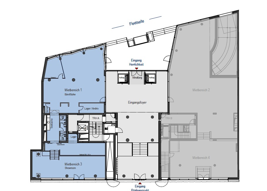 Über die Eingänge Rödingsmarkt und Herrlichkeit betretet Ihr das eindrucksvolle Ensemble aus Alt- und Neubau. Während ein Teil des ehemaligen Gebäudes stehen blieb, wurde dieser durch einen entsprechenden Neubau ergänzt und zu einem modernen Büro- und Geschäftsgebäude unweit des Hafens zusammengefügt. Blickbeziehungen zur Elbe, das Fleet und über die Dächer Hamburgs sind nur wenige Argumente, die für diese Immobilie sprechen.