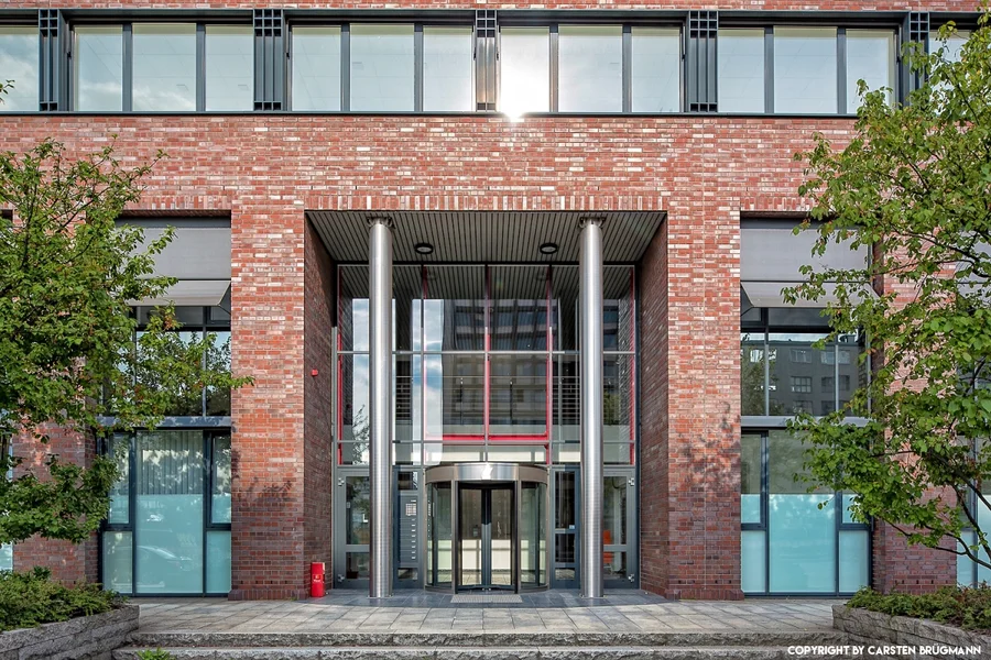 Das Gebäude am Heidenkampsweg erschließt Ihr über verschiedene, freundlich gestaltete Eingangsbereiche die sich an den jeweiligen Gebäudekernen orientieren. Große und regelmäßig angeordnete Fenster versorgen die Mietflächen mit einer guten Belichtung sowie einer effizienten Bespielbarkeit. So habt Ihr Möglichkeit, unterschiedliche Flächenstrukturen perfekt nach Euren Wünschen und Bedürfnissen realisieren zu lassen.