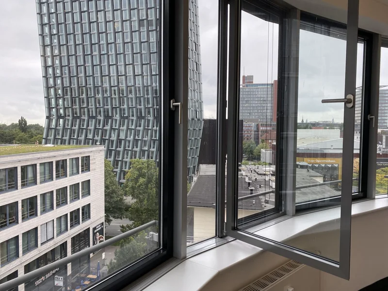 Im Inneren erwarten Dich moderne, flexibel gestaltbare Arbeitsflächen, die wir gerne nach Deinen Wünschen ausbauen lassen. Im 6. OG genießt Du 3 Meter hohe Decken und tolle Ausblicke über St. Pauli – ruhig, inspirierend und urban zugleich.