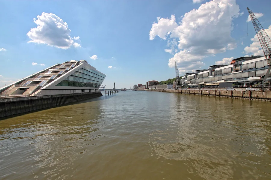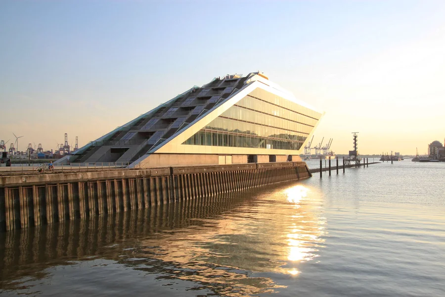 Das unverkennbare DOCKLAND liegt in direkter Wasserlage zwischen dem Edgar-Engelhard-Kai und dem Fischereihafen. Entworfen vom Hamburger Stararchitekten Hadi Teherani, erinnert das ikonische Gebäude mit seiner schiffsbugartigen Architektur an die maritime Geschichte Hamburgs. 40 Meter ragt das Gebäude über die Elbe – ein beeindruckendes Tor zur Stadt.