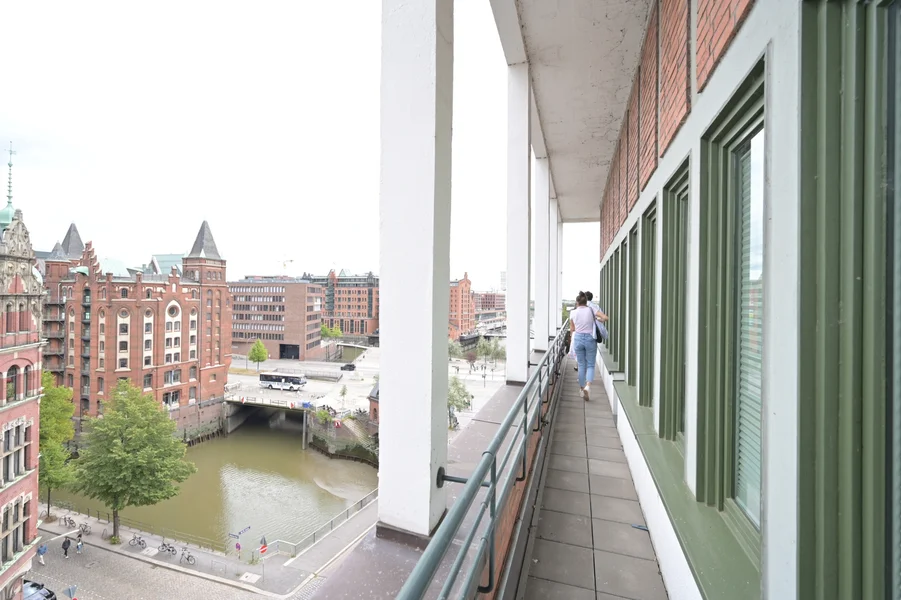 Knapp 3.000 m² ist der Solitär-Speicher groß. Die Flächen sind modern und im Agentur-Stil ausgebaut und werden über ein ansprechendes Erdgeschoss, welches ihr beispielsweise als Community Desk nutzen könnt, erschlossen. Dank der vielen Fenster sind die Flächen sehr hell und in gemischten Raumstrukturen ausgebaut. Es gibt interne Verbindungen für gute Kommunikationswege, einen eigenen Paternoster und im Topgeschoss sogar eine umlaufende Terrasse. Ab Anfang 2024 steht dieses Haus, nach einer aufwendigen Sanierung der Fassade, wieder zur Verfügung. Wenn ihr den Wunsch habt mitzugestalten, dann ist das hier durchaus möglich. Baut Euer eigenes Headquarter auf und genießt den puren Hamburg-Flair um New-Work und eine unverwechselbare Atmosphäre an Eurem Arbeitsplatz zu schaffen.