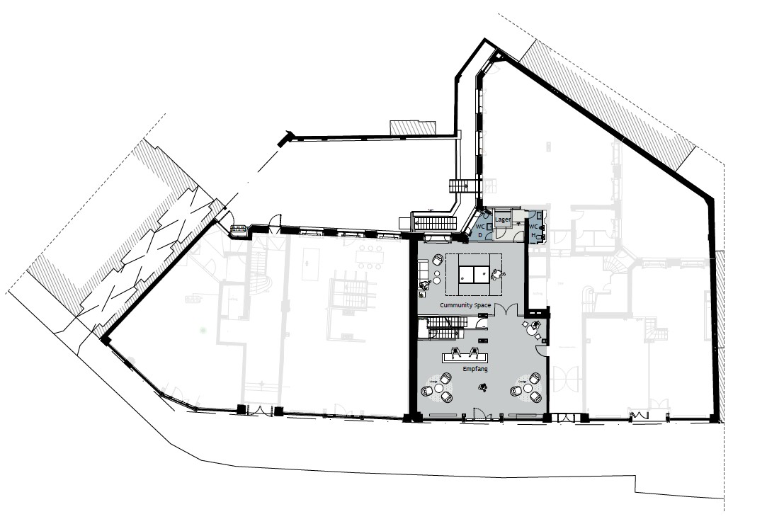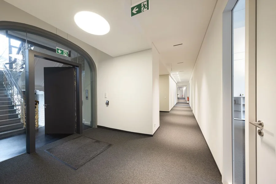Schon der sanierte Eingangsbereich mit liebevoll erhaltenen Stilelementen setzt ein Statement – und führt Dich direkt zu Deinen neuen hochwertig ausgebauten Büroflächen.