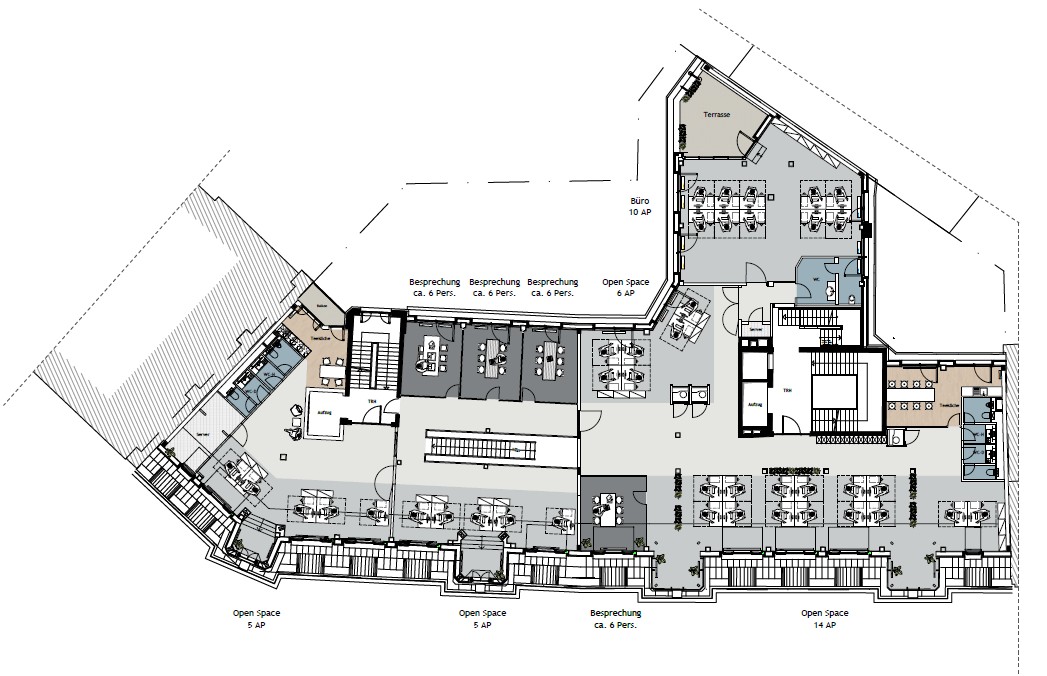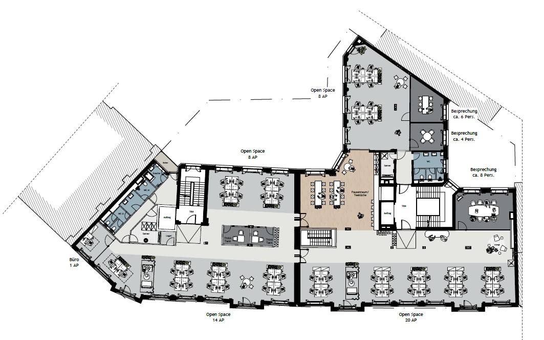 Große Panoramafenster, rund 3 Meter Deckenhöhe und viel Tageslicht sorgen für eine helle, offene Arbeitsatmosphäre. Die Flächen sind sofort bezugsfertig, werden aber vor Übergabe nochmal in Abstimmung mit Dir frisch aufbereitet – Du gibst den Feinschliff vor.