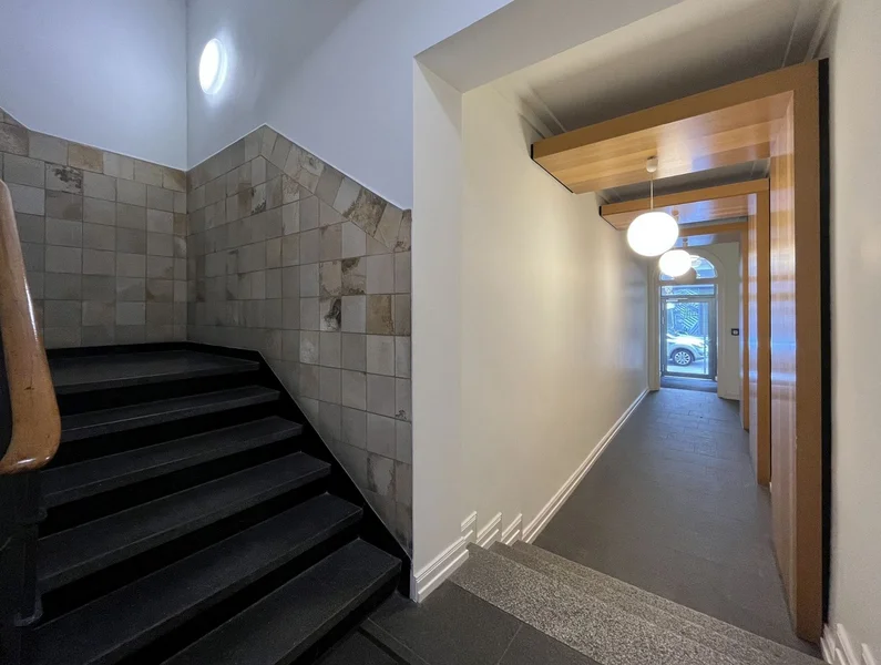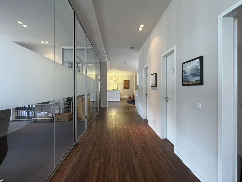Ein gepflegtes Entrée empfängt euch im Erdgeschoss, von dem aus ein Personenaufzug euch komfortabel in die einzelnen Etagen bringt. Dort erwarten euch lichte Räume mit hohen Decken, vielen Glaselementen und einer effizienten Raumaufteilung – inklusive eigenem Abstellraum auf der Etage.