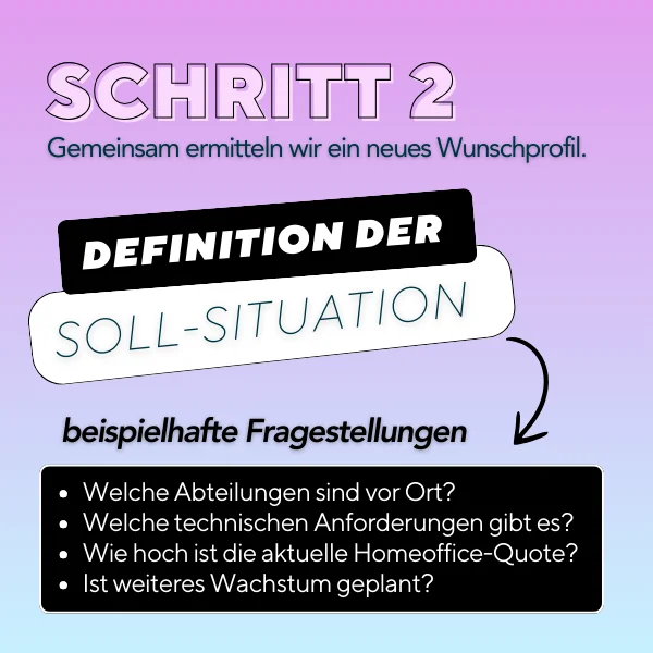 Dabei blicken wir auf jeden wichtigen Umstand bei der Nutzung Eurer Flächen. Wir möchten verstehen, was Euch gut gefällt und funktioniert - genauso beleuchten wir aber auch mögliche Schwachstellen (Painpoints) der aktuellen Büros.