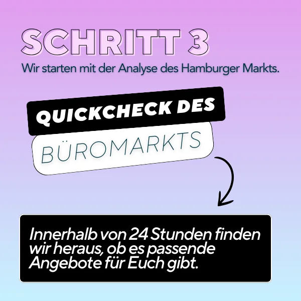 Wir finden umgehend heraus, ob es spannende und passende Angebote für Euch gibt. Eine erste Einschätzung erhaltet Ihr dann innerhalb von 24 Stunden. Als Basis fungieren dabei sogenannte "Hard-Facts" wie die Lage, Flächengröße, Bezugszeitpunkt, Mietpreise, gewünschte Flächenstrukturen oder auch Vertragslaufzeiten. Im Anschluss starten wir mit der Qualifizierung unserer Recherche und stellen Euch erste, konkrete und nachhaltige Ideen vor.